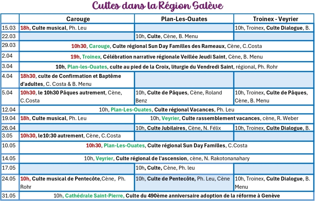 Tabelle des cultes dans les 3 paroisses de la Région